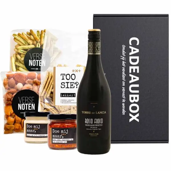 Dit borrelpakket met wijn heeft alle ingrediënten voor een gezellig avondje borrelen. In het borrelpakket wijn vind je een grote fles Italiaanse rode wijn: de Rosso Fuoco Negroamaro/Primitivo. Een originele blend van de twee belangrijkste druiven uit het zuiden van Italië. De wijn heeft een kenmerkende geur van gedroogd fruit. De smaak is zacht met fruitinvloeden van bramen, bosbessen, donkere kersen en pruimen. Soepel, smaakvol en de fles is leeg voordat je het door hebt!