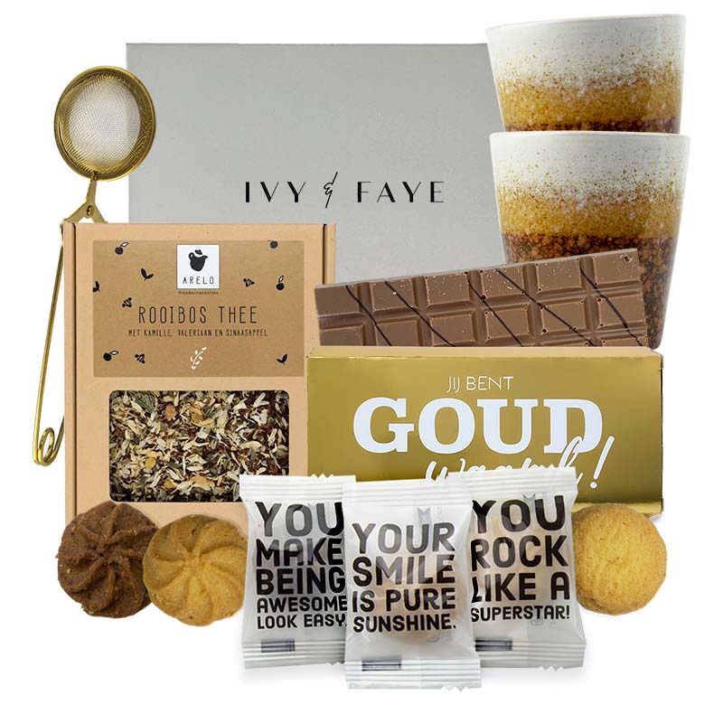 Soms wil je iemand écht laten weten hoeveel hij of zij betekent. Dit stijlvolle theepakket draait helemaal om die ene boodschap: jij bent goud waard. Met luxe thee, warme details en een (h)eerlijke chocoladereep is dit een cadeau perfect voor iedereen die wel wat waardering verdient.