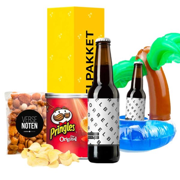 Het mini Zomerpakket bevat een drankje naar keuze, Pringles chips, gele strandbal, Cadeaumakers vrolijke notenmix en een ‘Zomerborrel’ cadeauverpakking.